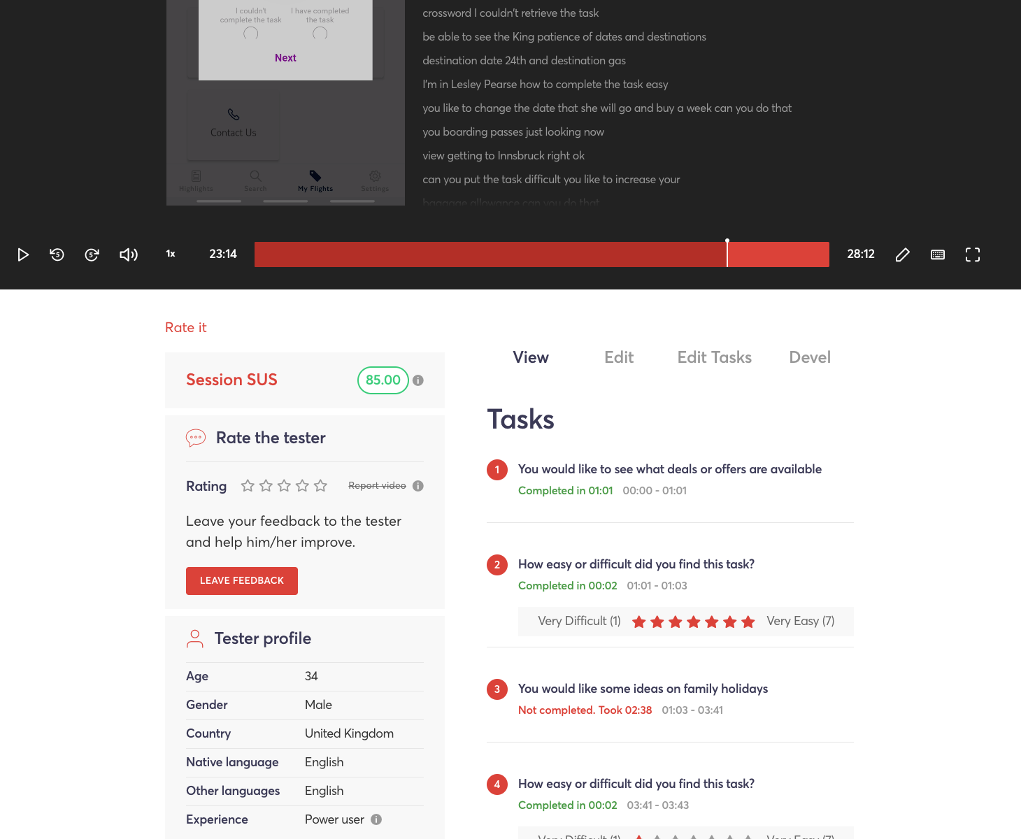 Once tests are completed, video recordings of the sessions, along with transcripts and automated insights, become available on the Userbrain dashboard. This feature helps product teams identify bugs, validate design choices, and gather user feedback efficiently across multiple devices, including phones and tablets.