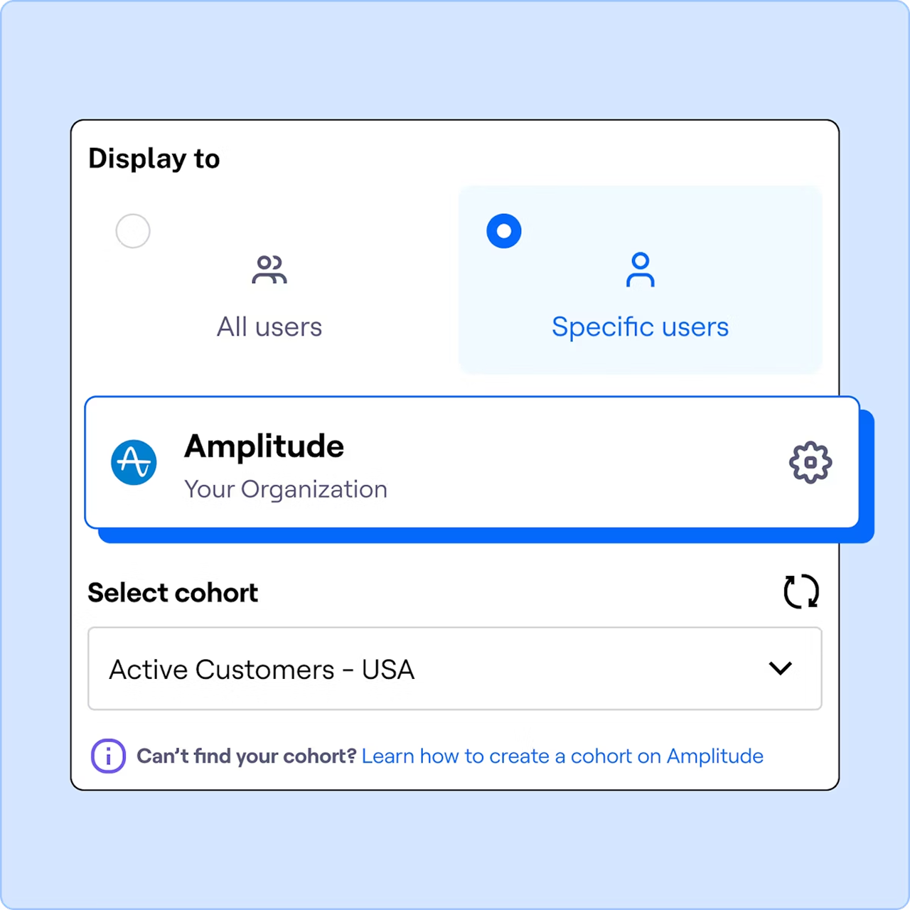 Up research engagement without marketing know-how. Watch response rates fly as you tie feedback prompts to specific URLs—or take targeting a step further with our Amplitude integration that puts prompts in front of your specific cohorts.
