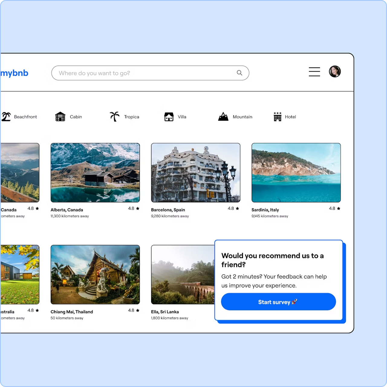 Ask questions as users experience your products. Get ongoing feedback, recruit, and reduce time to insight with in-product prompts.