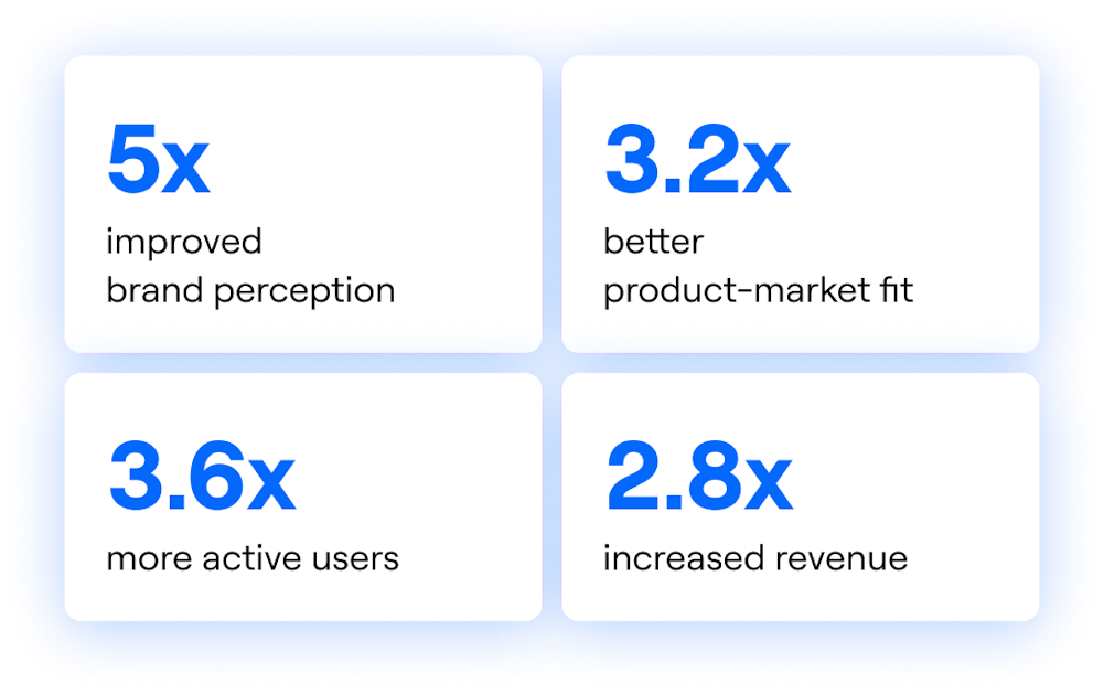 When research is deeply integrated into product and business decisions, the impact is even more evident. Organizations that embed research into their business strategy and operations report 2.7x better outcomes compared to those that rarely incorporate user insights. In particular, they see enhanced brand perception (5x) and more active users (3.6x).
