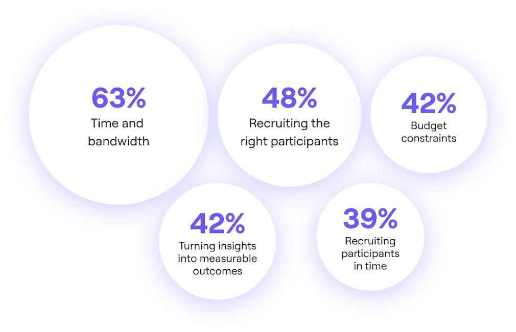 Most research requests come from product and design teams, seeking insights to improve product usability, understand customer needs and preferences, and validate hypotheses. Product teams face pressure to move quickly, with time and bandwidth constraints cited as the top challenge for 63% of respondents.