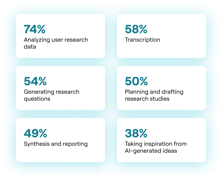 Product teams are leveraging AI to automate the most time-intensive components of research, including analyzing user research data (74%) and transcription (58%). With the right safeguards in place, AI enables teams to augment human expertise and scale research without sacrificing depth or quality.