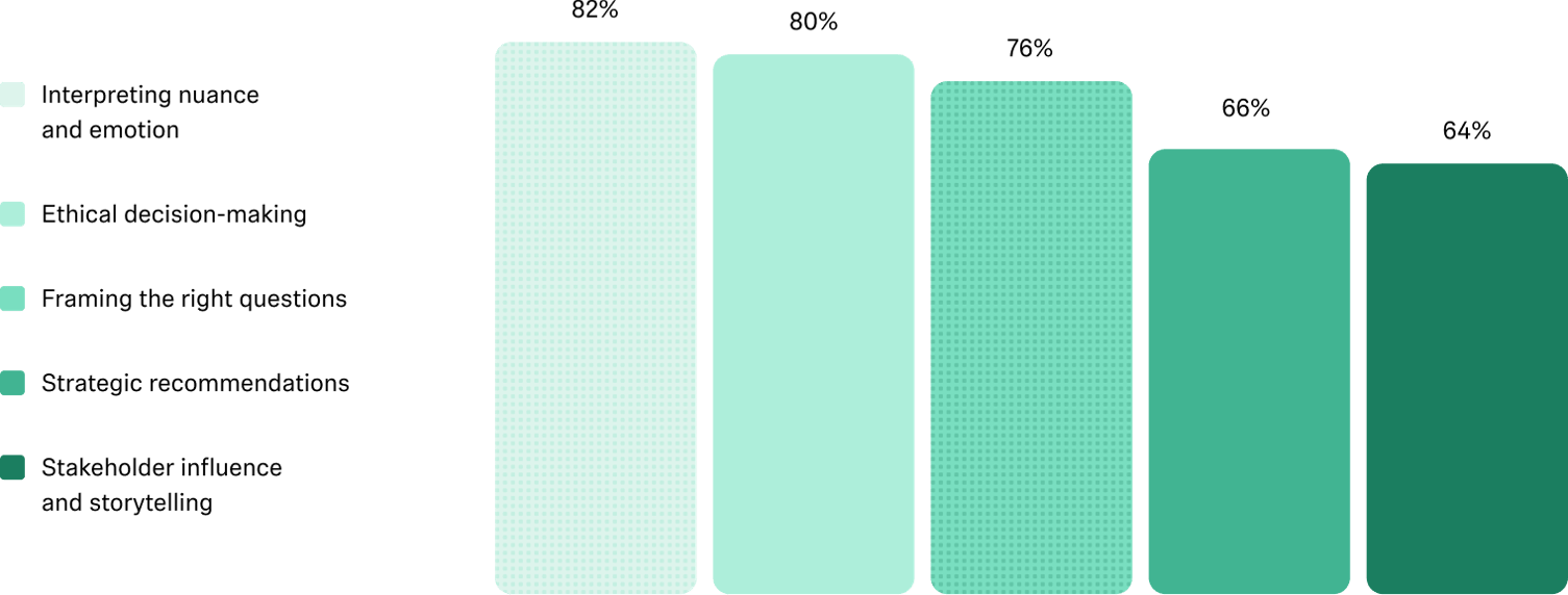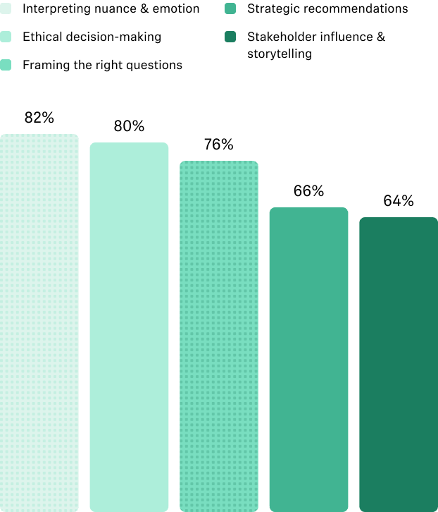 No—and the data backs this up clearly. While 69% of researchers now use AI in their workflows, human judgment is becoming more important, not less. Researchers overwhelmingly identify interpreting nuance and emotion (82%), ethical decision-making (80%), and framing the right questions (76%) as areas where human involvement is essential and can't be replicated by a tool.