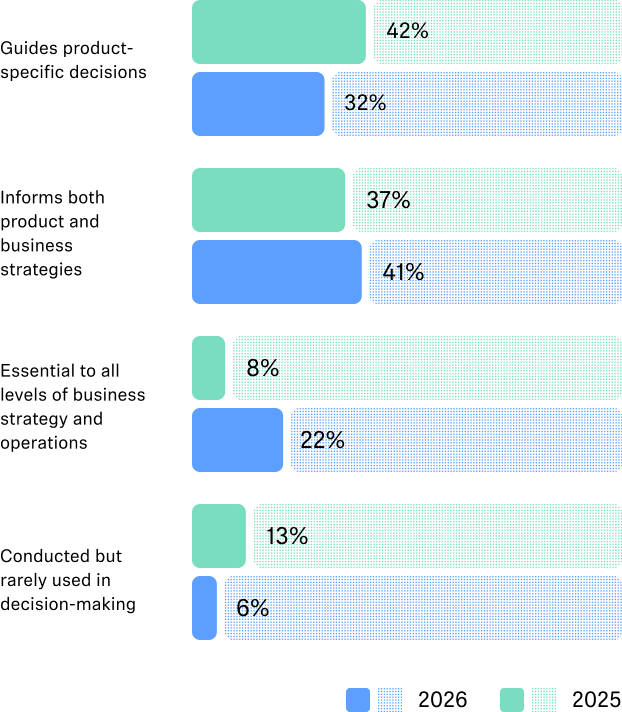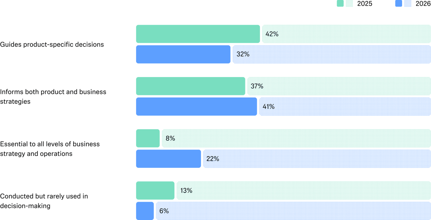 The number of organizations where research is essential to all levels of business strategy nearly tripled in a single year—from 8% in 2025 to 22% in 2026.