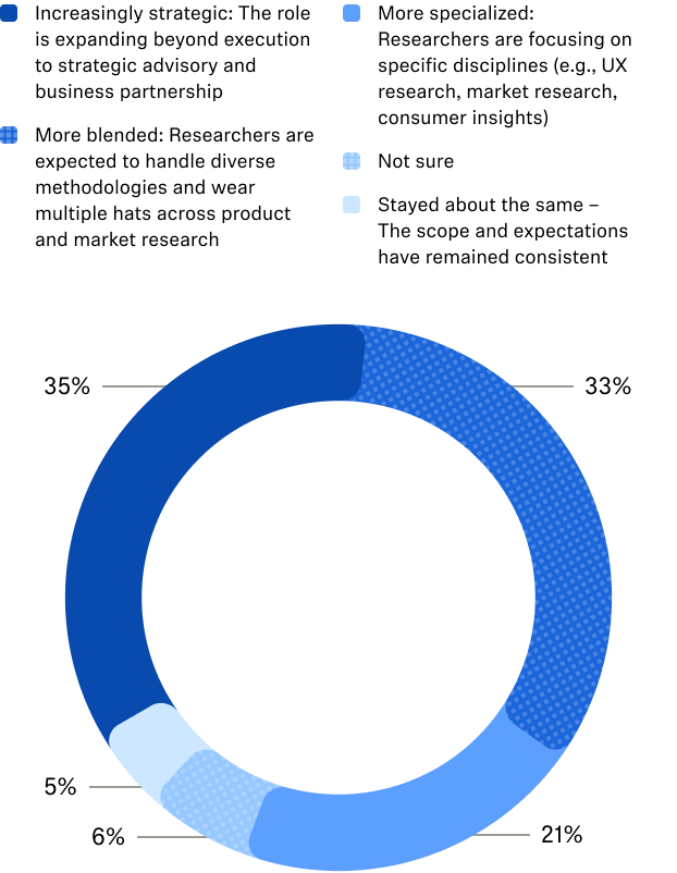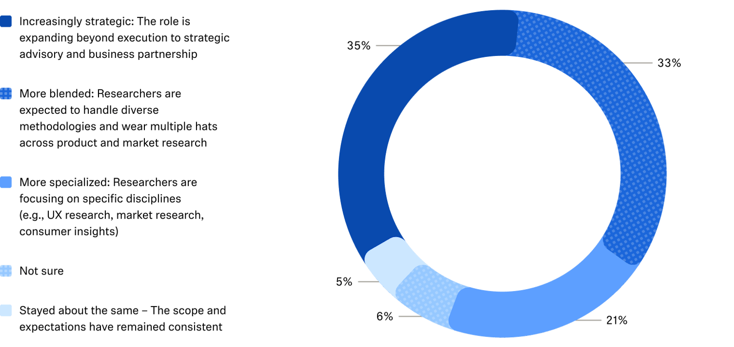Over a third (35%) of participants believe the role of the researcher is becoming more strategic, while (33%) believe the role is becoming more blended.