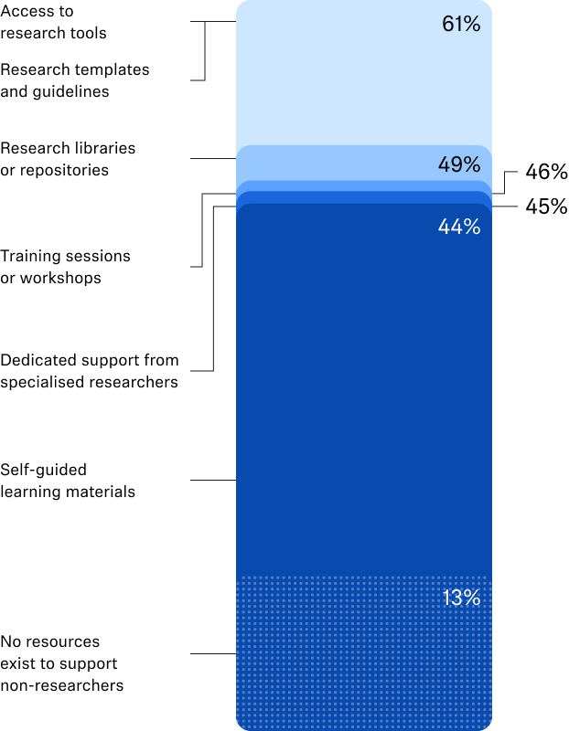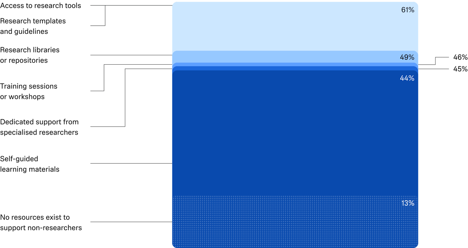 61% of organizations provide access to tools and templates, but fewer than half offer dedicated support from specialized researchers (45%), structured training (46%), or research libraries (49%). 13% report having no resources at all to support non-researchers.